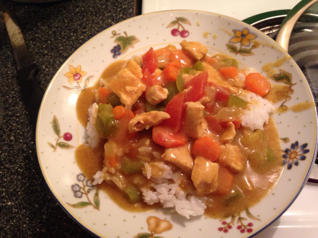 Ingredients: 1 box Golden Curry© Sauce mix (3.5 oz) 2 chicken breasts coconut oil lemon juice 1/2 can coconut milk 1/2 onion 2 roman tomatoes 1/2 green pepper 3 carrots 2 1/2 c. water rice