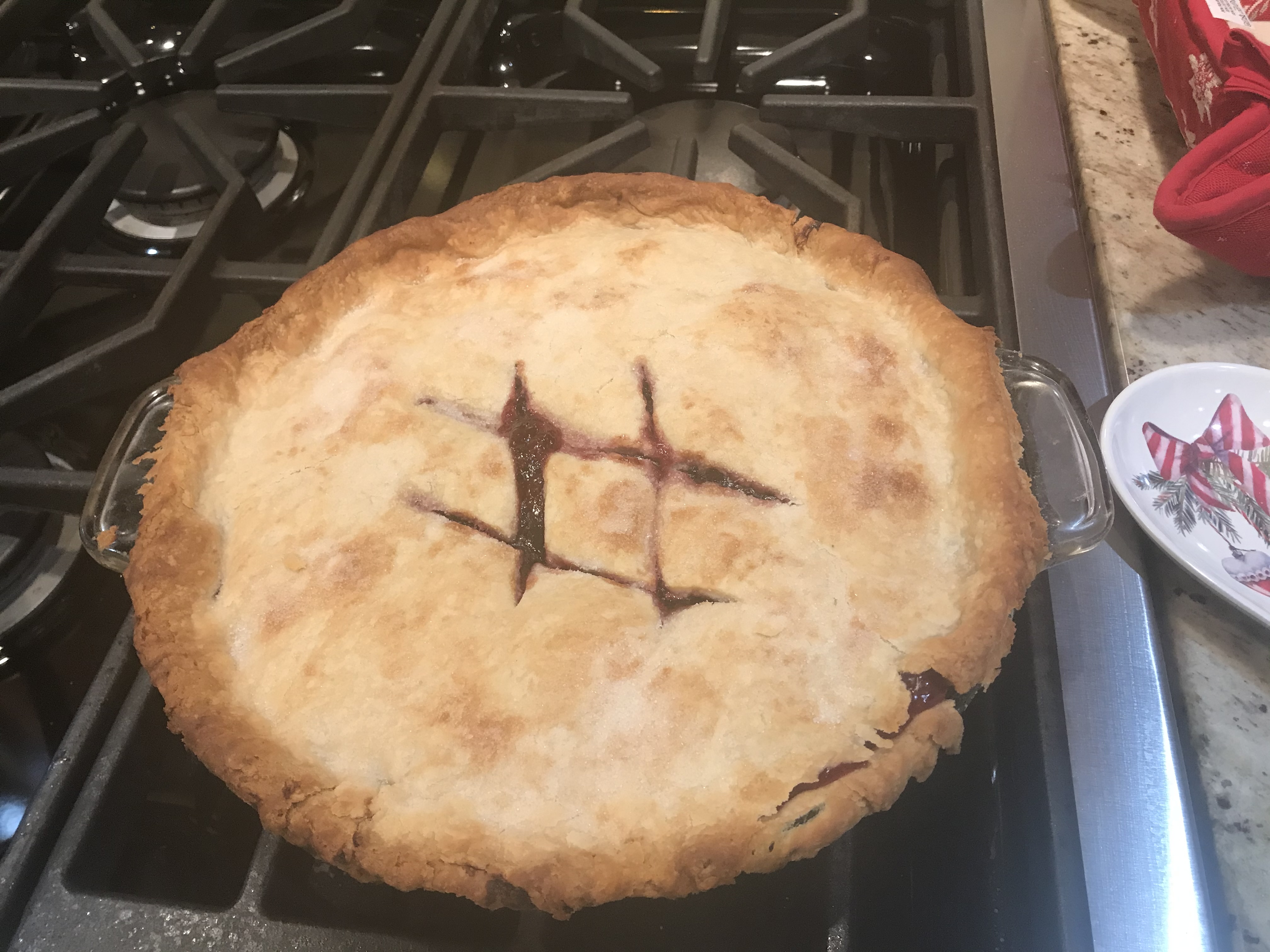 Repeat pastry rolling with the second half of the pastry to cover the pie. Pinch the edges around the pie plate. If you'd like, cut 2 criss cross strips in center of pie and sprinkle with sugar before baking.