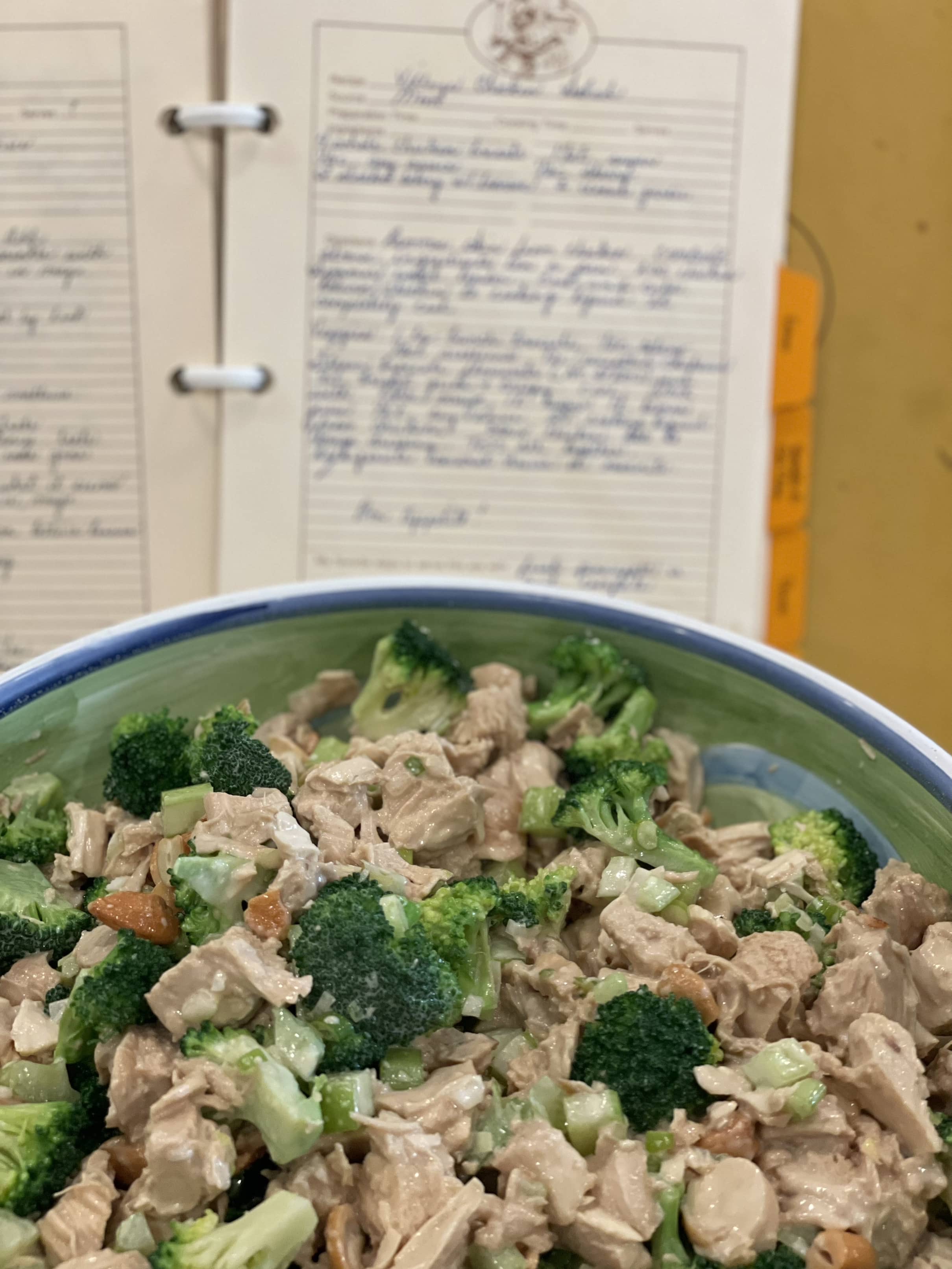 Drain chicken from cooking liquid, add to bowl with broccoli Toss together with celery, scallions and nuts Add dressing and mix well