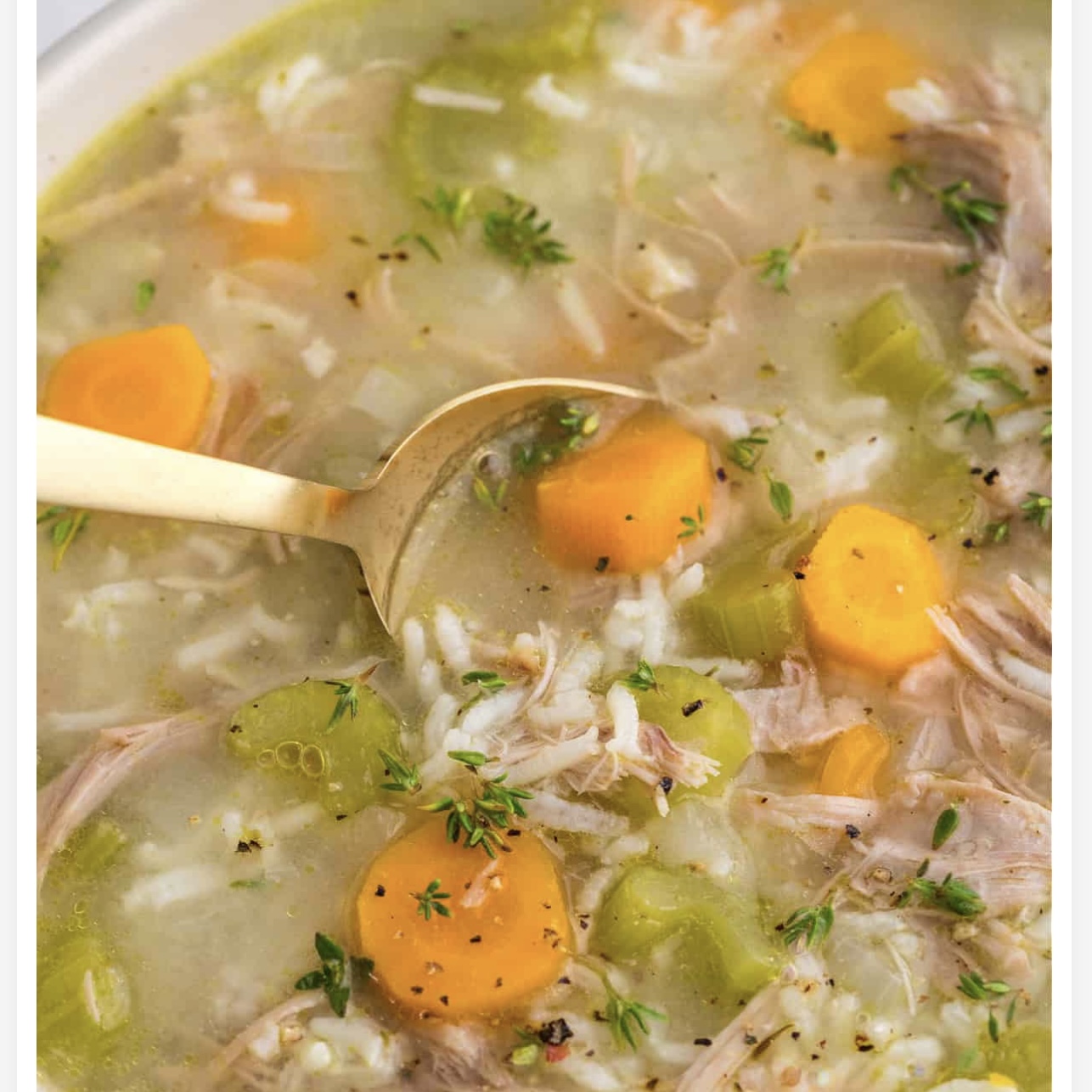 Directions:Sauté the veggies Heat the olive oil in a large pot over medium heat. Add the diced onion, carrots, and celery. Cook for about 5 to 6 minutes, stirring occasionally, until the veggies soften. Add the seasoning Sprinkle in the garlic powder, dried thyme, salt, and black pepper. Stir for another 30 seconds or so to wake up those spices. Pour in the broth and add rice Add the chicken broth and bring it to a gentle boil. Once it’s bubbling, stir in the uncooked Simmer it down Reduce the heat to low and let the soup simmer uncovered for 18 to 20 minutes, or until the rice is fully cooked and tender. Add turkey and warm through Stir in the shredded cooked turkey and let everything simmer for another 5 minutes so it’s heated through. Serve and garnish Ladle into bowls and top with a few sprigs of fresh thyme. Serve hot. Notes You can use any leftover turkey here, white or dark meat, or even chicken if that’s what you’ve got.